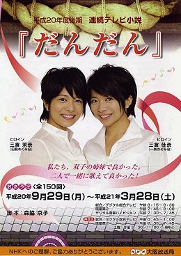 次期NHK連続テレビ小説「だんだん」(29日スタート、月-土曜前8・15)の試写会が1日、大阪市の同局であり主演の双子女優の三倉茉奈(22)佳奈(22)姉妹らが出席した。島根と京都を舞台に、幼いときに別れた双子が出雲大社で出会って、ともに歌手を目指す物語。島根の女子高生を演じる茉奈は「竹内まりやさんの主題歌と語りに感動」と笑顔。初挑戦のギターには「実際に弾いたんですが、他の人の音に替わってなくてよかった」と、ほっとしていた。舞妓役の佳奈は「京舞の井上流を勉強しました。着物での撮影は大変でした」と夏の京都ロケを振り返った。