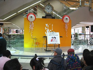イベント3連チャンの締めは近鉄阿倍野店9F、京都物産展に絡んでマナカナトークショー。狭いスペースに大観衆密集★ MCはお馴染みの駒田さん。マナちゃんピンク、カナちゃんブルー系のワンピースセーターでブーツも色違いで、ヘアメイクもばっちりのオシャレな装いでした(後の番組にもそのまま出演)。