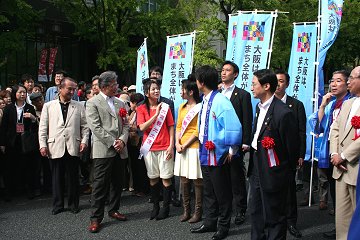 イベント前から聞くスタッフによって説明が変わったり、第一回開催でグダグダ感も。知事を護衛するSPは勇ましかったです。 御堂筋を行進する「Kappo」はぶっちゃけ先回りして追っかけ~というか着いていかないと次のイベント場所がよくわからないし(^^; 笑顔で手を振りつつ、知事や市長に挟まれて闊歩するマナカナちゃんでした。