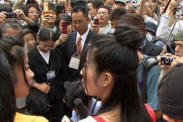 大阪ガスビル近くでカッポ終了後、しばし間をおいてちょい移動した様子。気づいたら、おそらく二人が群衆に囲まれてたので、どうにか後方へは近づけ。マナカナ&市長で、ばんばさん?にインタビュー受けてました。MBSラジオかと思います。
